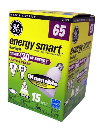 PINK GE Energy Smart 15 Watt Dimmable Pink CFL Floodlight. Equivalent to 65 watts. Works with most dimming switches. R30 Equivalent. Light output: 720 lumens. Energy used: 15 watts. Life: 6000 hours.